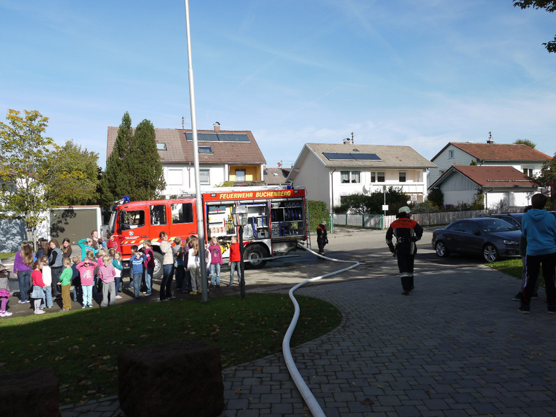 Am Freitag, 5. Oktober, löste um 10:15 Uhr die Schule Buchenberg einen „Feueralarm“ bei der Integrierten Leitstelle Allgäu aus. Um 10:18 Uhr heulten in Buchenberg, Eschach, Wirlings und Ermengerst die Sirenen. Um 10:22 Uhr traf das erste, nach vier weiteren Minuten das zweite Löschfahrzeug der Feuerwehr Buchenberg am „Brandobjekt“ ein. Fast im Minutentakt folgten die Fahrzeuge der Feuerwehren Eschach, Wirlings und Ermengerst.